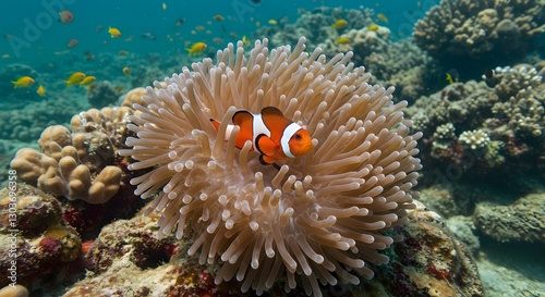 clownfish, anemone, coral reef, underwater, wildlife, closeup, wild animal, natural light, swimming, half face, profile, conservation, marine life, colourful, documentary