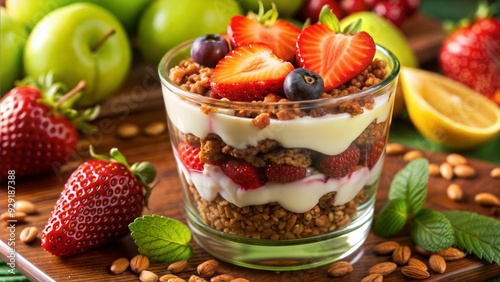 parfait, granola, fruit, fresh, healthy, vibrant, dessert, colourful, light, refreshing, alimentary, breakfast, snack, layered, creamy, vegan, sweet, organic, lifestyle, epicure, culinary, treat, food photography, closeup, delicious, brunch, texture, natural, simplicity, artisanal, catering, party, celebration, festive, holiday, spring, summer, concept, energy, vitality, wholesome, indulgence, seasonal, enjoyment, nourishment
