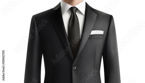 Refined black business suit, meticulously illustrated, white background, showcasing high-definition detail, 32k resolution
