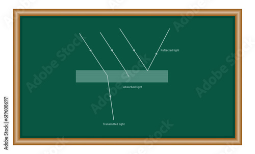 Reflection absorption and transmission of light. Light falls on a surface. Properties of light diagram. Vector illustration isolated on chalkboard.