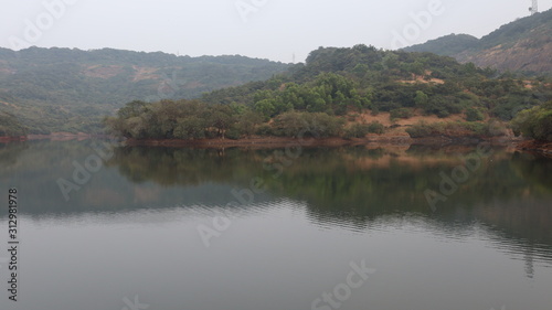 Reflection of a lush green hills over a lake. Scenic background with natural beauty.