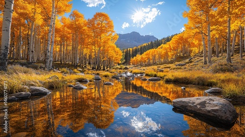 autumn, forest, creek, tree, yellow leaf, golden yellow, water surface, sky, cloud, sunshine, mountain, stone, calmness, landscape, nature, tour tourism, season, plant, wood, river, bright, warm, vibrant, beautiful, fresh