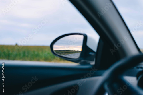 Reflection of the route in the side mirror of the car. Sunset. Summer. Travelling by car.