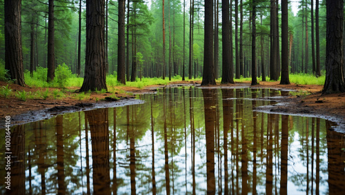 Reflections of towering pine trees in a forest puddle after rainfall, highlighting the quiet of nature