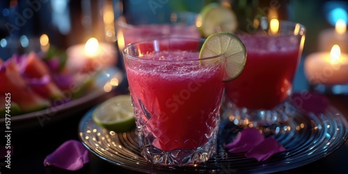 cocktail, drink, lime, evening, gathering, red, pink, stylish, table, candlelight, floral, decoration, glassware, refreshing, celebration, party, garnish, social, beverage, leisure, relaxation, summer, event, happy, taste, favor, sweetness, fruit, ice, atmosphere, ambience, nightlife, entertaining, guest, enjoyment, toast, cheer, fine dining, friends, lounge, aroma, festive, hospitality