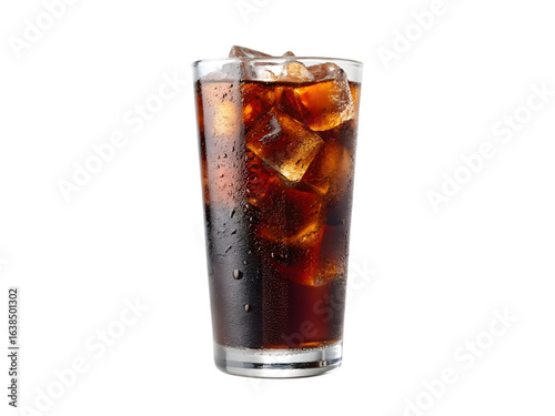 Refreshing glass of ice cold cola with condensation and ice cubes, perfect drink