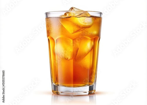 Refreshing glass of iced tea with lemon and ice cubes on white