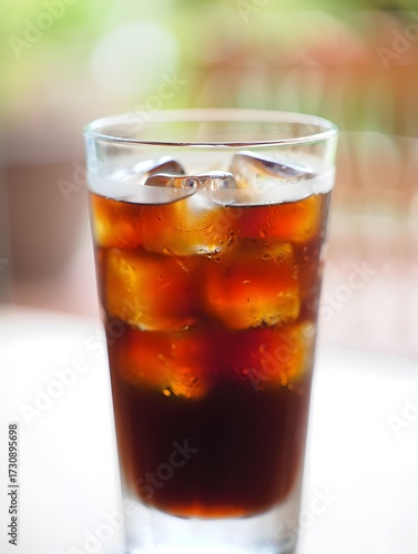 Refreshing iced coffee drink with ice cubes in a clear glass