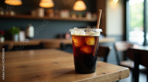 Refreshing Iced Coffee in a Disposable Cup on a Wooden Table in a Cafe