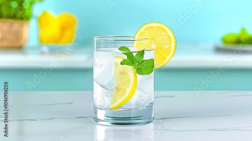 Refreshing iced lemon water with mint garnish on marble countertop.