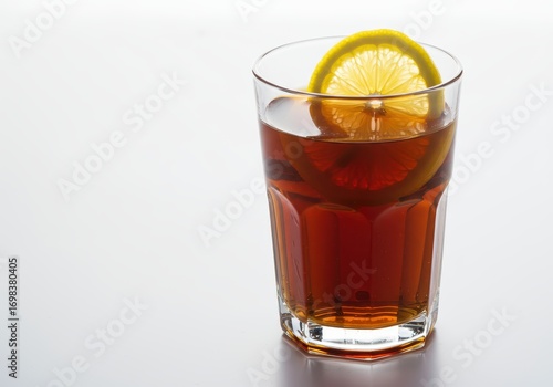 Refreshing iced tea drink in a glass with a lemon slice, showcasing a rich brown hue and simple elegance.