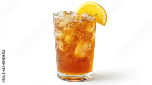 Refreshing iced tea with lemon wedge and ice showcased on a clean white background for beverage advertising and promotion.