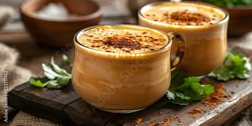Refreshing Indian Buttermilk with Fresh Coriander on Rustic Wooden Table. Concept Indian Cuisine, Buttermilk Recipe, Fresh Coriander, Rustic Table Setting, Refreshing Drink