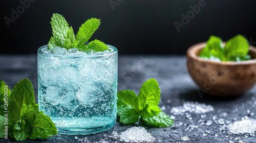 drink, mint, iced, refreshing, cocktail, beverage, ice, summer, cold, water, leaf, glasses, food, cool, healthy, tasty, liquid, texture, blue, green, botanical, gastronomy, chilling, carbonated, crisp, fizzy, menthol, aroma, herb, nature, fresh, purity, clean, vibrant, sparkling, elegant, style, delight, luxury, treat