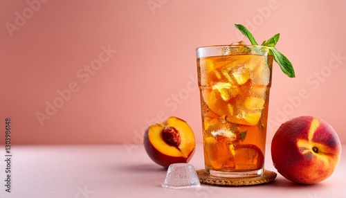 refreshing peach iced tea with ice cubes and fresh peach on pink background