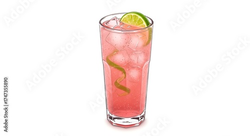 Refreshing pink cocktail illustration with ice, lime and garnish on white background.