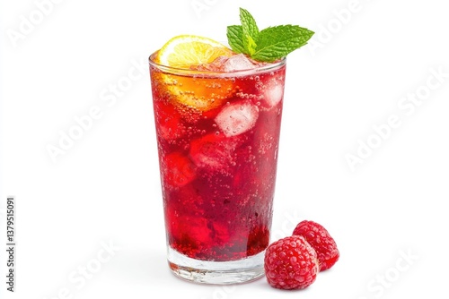 Refreshing Raspberry Lemonade with Ice Cubes and Mint Garnish on White