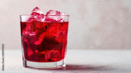 Refreshing red fruit juice in a clear glass with ice cubes on a light textured surface