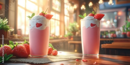 Refreshing strawberry milkshakes served in a cozy cafe on a warm afternoon with fresh strawberries