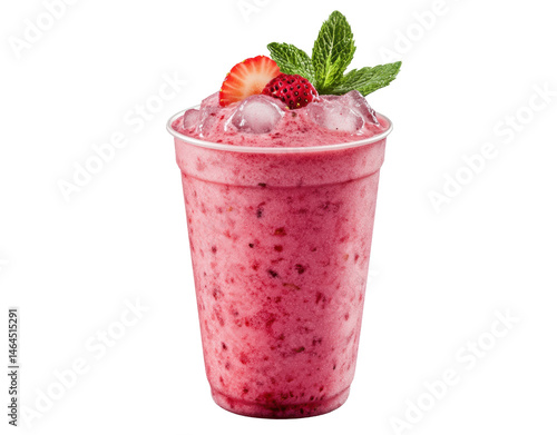 Refreshing strawberry mint smoothie served in a clear cup with ice, cut out