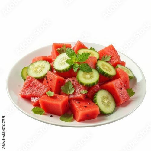 Refreshing Summer Salad Featuring Watermelon and Cucumber on a White Plate with Mint Garnish
