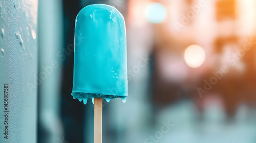 Refreshing summer treat: A melting blue popsicle against a blurred background