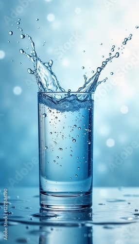 Refreshing water splash in glass. Hydration, vitality visually enhanced against soft blue background. Pure water flows in glass with bubbles. Coolness, elegance of beverage highlighted. Healthy,