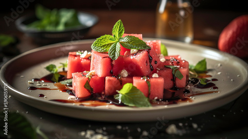 Refreshing Watermelon Feta Salad with Mint and Balsamic Glaze on White Ceramic Plate.