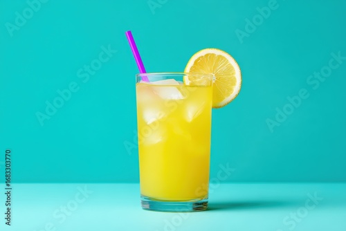 Refreshing yellow beverage in a clear glass with ice cubes, garnished with a lemon slice and a pink straw, set against a vibrant turquoise background for a summer vibe