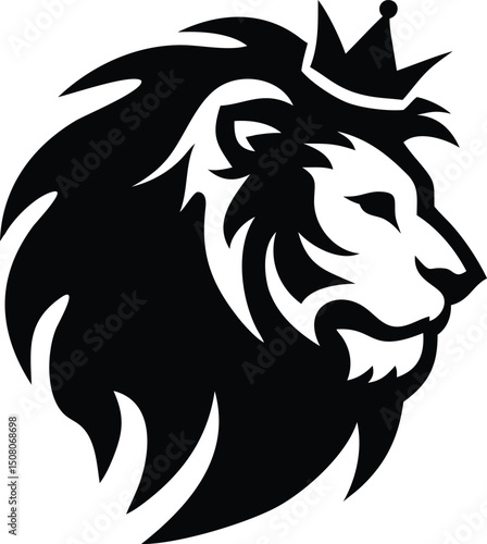 Regal lion head with a crown depicts strength and leadership in black silhouette