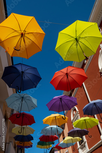 umbrella, screen, stretched, decoration, decoration, colourful, colourful, red, blue, purple, grey, yellow, colourful, alley, istria, croatia