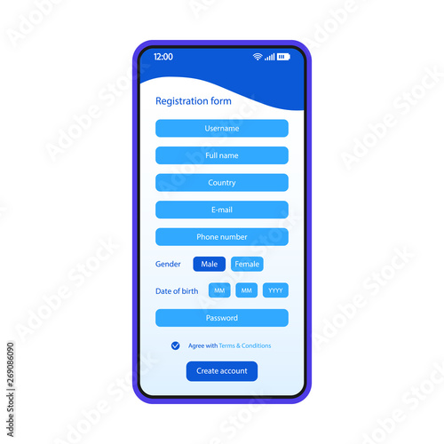 filed, login, interface, mobile, application, app, sign up, form, registration, create, account, field, blue, new, website, flat, text, icon, user, phone, screen, online, template, web, design, display, buttons, profile, cyberspace, digital, smartphone, smart, mobile phone, window, realistic, layout, element, wireframe, concept, vector, isolated, mobile phone, tab, gui, page