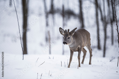 cervid, animal, snow, winter, wildlife, mammal, nature, game, forest, brown, white, doe, buck, fur, reindeer, cold, young, antler, horn, stag