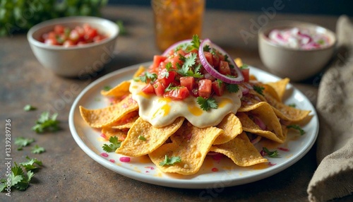 nacho, cheese, salsa, cookery, plate, food, mexican, appetising, pico, onion, vibrant, melted, lighting, photorealistic, shadow