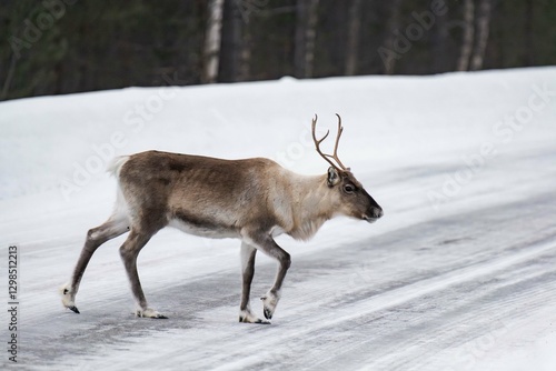 Reindeer (Rangifer tarandus) walking on a street in Finland in winter.
