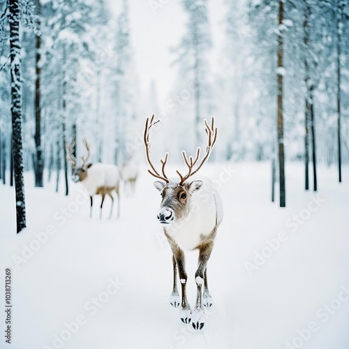 Reindeer with frosted fur walking through a quiet, snow-laden Lapland forest