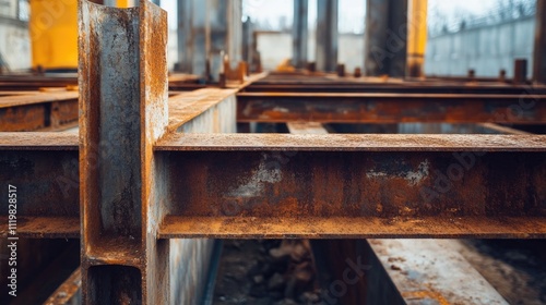 steel, beam, reinforced, construction, site, rust, industrial, material, natural, lighting, architecture, structure, heavy, support, framework, fabrication, building, industry, metal, men at work, infrastructure, strength, durability, exposure, design, oxidized, texture, factory, environment, safety, engineering, tool, equipment, labor, project, urban, skyline, development, weathering, scaffolding, machinery, commercial