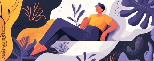 Relaxed man lounging in abstract nature scene with plants, minimalist shapes, and bold colors - vector.
