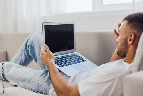 relaxed, man, laptop, home, remote, work, cosy, modern, lifestyle, digital, technology, contemporary, indoor, sofa, comfort, leisure, casual attire, connectivity, screen, interaction, browsing, sitting, professional, productivity, workspace, home office, personal, style, atmosphere, happiness, innovation, creativity, sharpened, bright, inspiration, online, behaviour, social, 2025, 2026, trend, relaxation