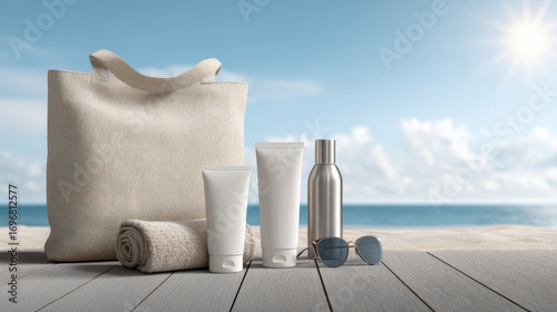 beach, tote bag, sunblock, skincare, sunglasses, summer, relaxation, ocean, towel, travel, vacation, sun, sea, accessory, leisure, lifestyle, beauty, health, protection, nature, horizon, blue skies, enjoyment, essential, sun tanning, coastal, calmness, freshness, casual attire, adventure, fun, bright, holiday, wellness, sun protection, natural, vivid colors, leisure time, sunlit, peaceful, scenic