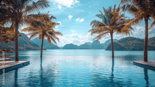 Relaxing in a tropical infinity pool surrounded by coconut trees breathtaking view of landscape tranquil environment tropical paradise