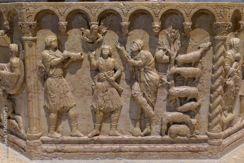 giovanni, in, baptismal font, of, verona, annunciation, to, the, romanesque, sculpture, relief, shepherd, angel, sheep, stone, carving, art, iconography, christianity, italy, church, marble, octagonal, architecture, narrative, catholic, biblical, historic, heritage, figure, scene, sacred, mediaeval, altar, tradition, religion