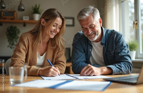 insurance, couple, signing, home, office, paperwork, document, finance, planning, family, responsible, organised, lifestyle, security, preparation, personal finance, middle-aged, business, woman, people, senior, work, old, group, cheerful, happy, smiling, agreements, contract, investment, savings, retirement, policy, protection, coverage, health care, pension, real estate, mortgage, loan, tax, legal, advice, consulting, service, professional, adviser, client, client, agent