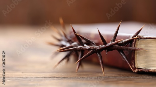 religious symbolism, close-up of a crown of thorns on a bible, against a rustic wooden background and moody lighting, symbolizing christs suffering