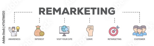 Remarketing banner web icon illustration concept with icon of awareness, interest, visit your site, leave, retargeting and customer icon live stroke and easy to edit