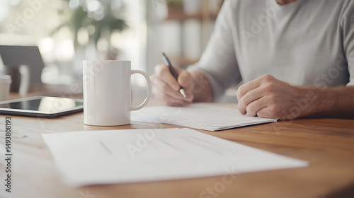 desk, writing, mug, paper, tablet, wooden table, hand, pen, document, form, window, light, office, home, workspace, telecommuting, contract, finance, planning, strategy, work, study, morning, business, education, technology, modern, minimalist, indoor, white, brown, lifestyle, adult, man, person, reading, learning, note, hot drink, hot beverage, beverage, drink