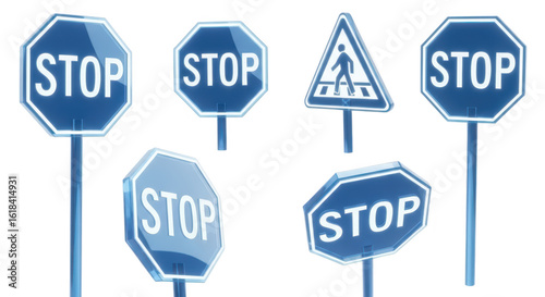 Rendered stop signs and pedestrian crossing icons are digitally displayed highlighting traffic control and safety against a white background for design use