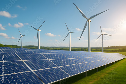 Renewable Energy Landscape: Capturing the essence of sustainable energy with solar panels and wind turbines working together under a bright sunny sky.
