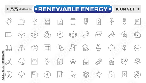 Renewable energy Outline icon set. Energy, efficiency, solar energy, green, sunlight, wind, and water outline icon collection. UI thin outline icon pack. Editable stroke outline icon.