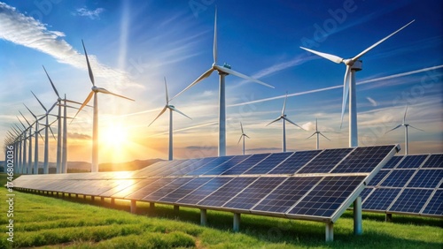renewable energy, solar energy, wind power, clean energy, sustainability, sunlight, environmentally friendly, technology, environment, renewable resources, solar panel, landscape, green energy, horizon, energy production, electricity, field, sun ray, nature, power generation, climate change, innovation, agriculture, natural resource, energy efficiency, future, scenic, blue skies, cloud, alternative energy, earth, nature conservation